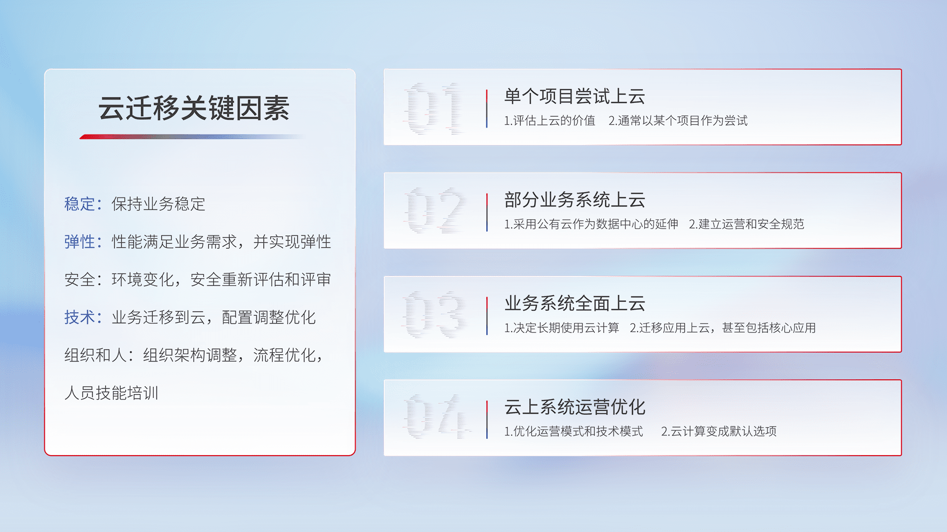 结合实际业务,,从规划设计、、、、云平台选型、、云原生改造、、数据迁移、、、集成交付,,,,迁移全过程为客户识别最佳上云路径,,做好风险识别管理,,,,设计网络架构、、、身份权限、、、、安全审计合规、、、操作审计、、、日志审计、、监控告警策略、、、、多站点容灾设计等,,,对云上基础设施进行整体规划,,提升IT治理水平,,以满足弹性、、高可用、、高性能的需求。。。。